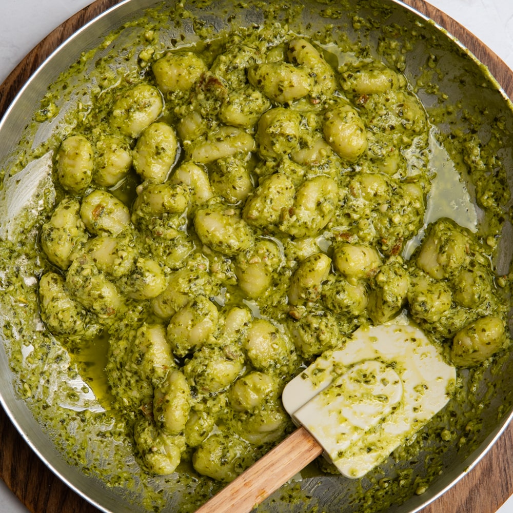 - Pour in the pesto, let it simmer for a minute (don’t let it boil!), then take it off the heat and stir in the cream. Season with a pinch of salt