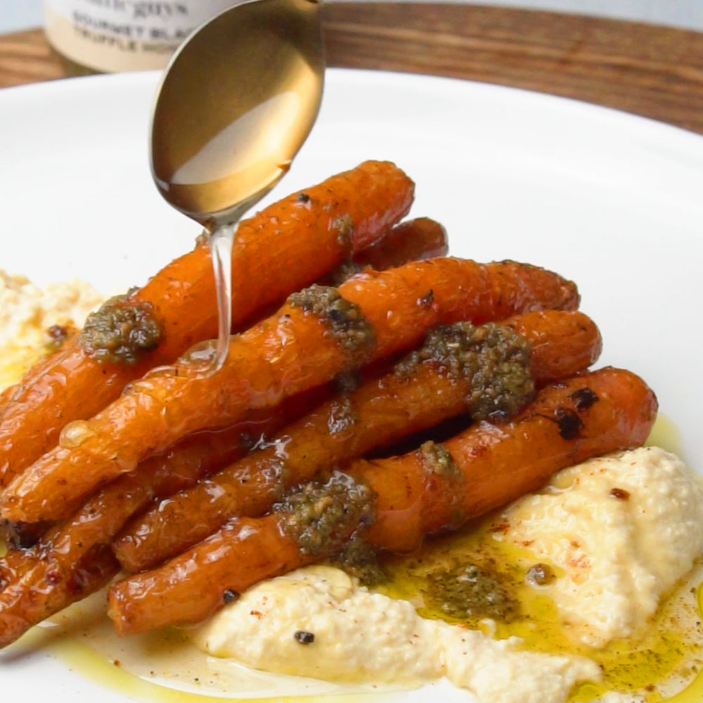 The perfect winter side! Decadent Truffle Roasted Carrots on a bed of creamy Hummus with Pesto & Truffle Honey. A truly magical combination.