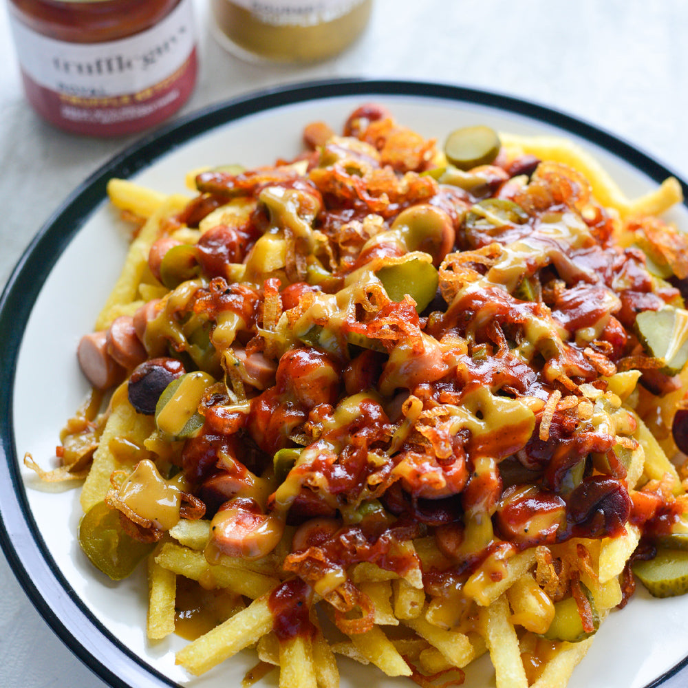 - Season the fries then place them on a plate and top with the hot dogs, crispy shallots, pickles, jalapeños and finally the truffle ketchup and mustard. To get those classic hot dogs sauce lines, place the sauces in squeezy bottles and squirt zigzags all over the fries.
