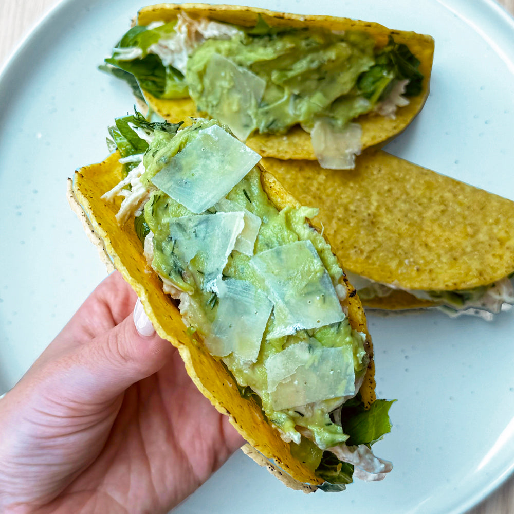 - Assemble to taco by adding a base of fresh lettuce, topped with the shredded chicken and guacamole and finish with parmesan shavings and an extra sprinkle of truffle dust.