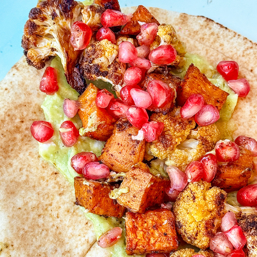 - Assemble the taco by adding a generous layer of avocado cream topped with the roasted vegetables and pomegranate pearls. Finished with a light sprinkle of truffle dust