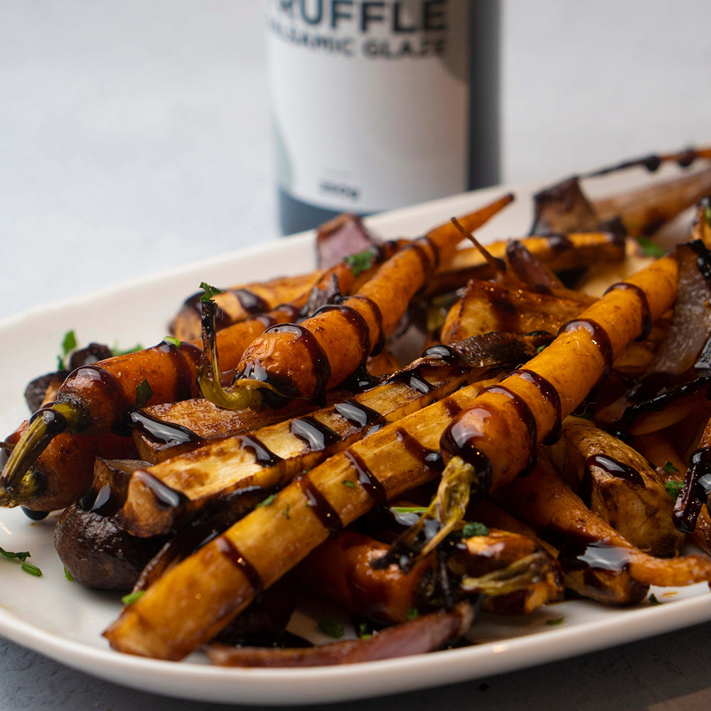 - Remove the tray from the over and add the vegetables to a serving plate. Before serving give that wholesome plate of goodness some extra loving by another helping of the Truffle Guys Seriously Good Balsamic Glaze and serve.