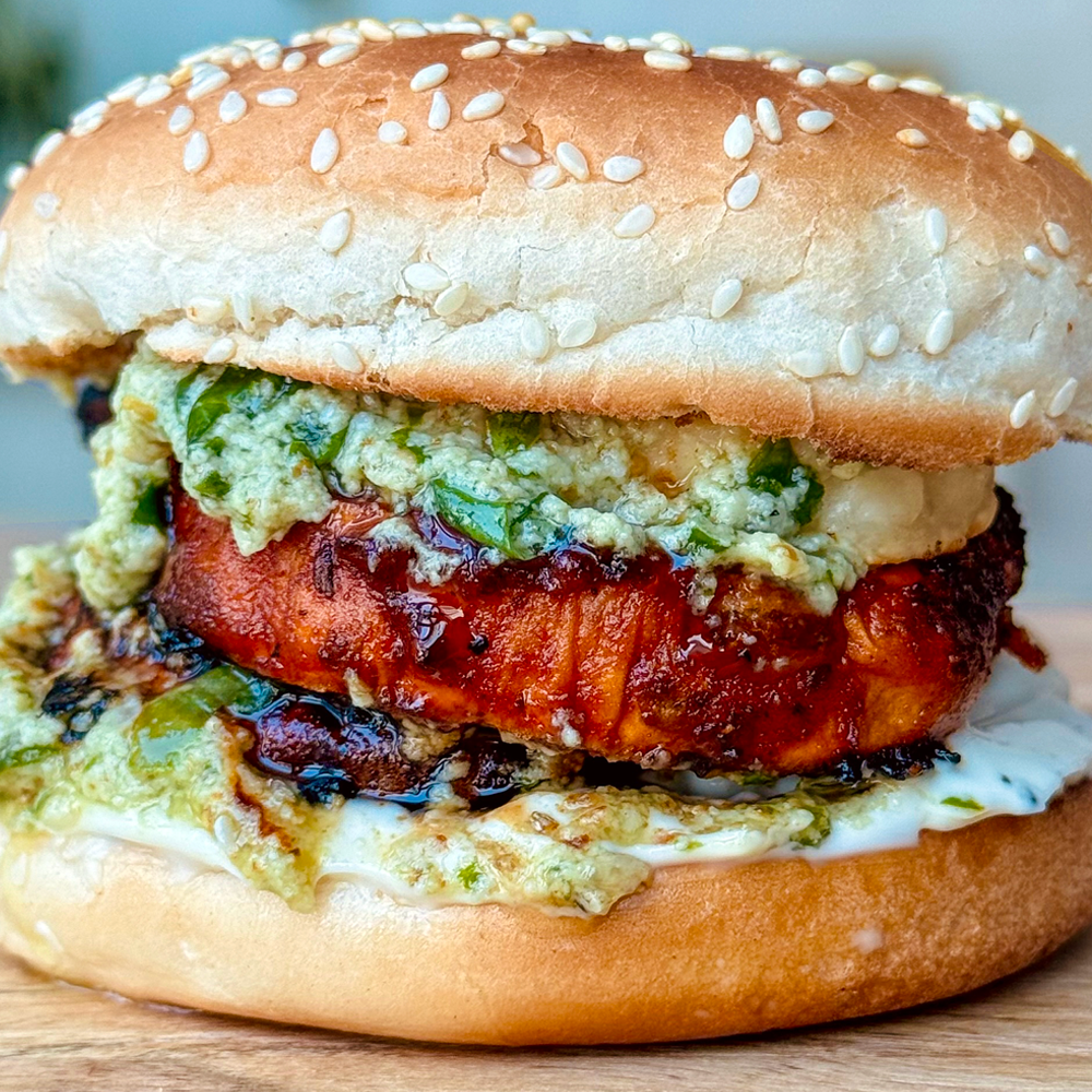 - Toast your burger bun and dollop with Truffle Mayo, then start layering with the Truffle BBQ, sweet potato, pesto, more sweet potato and halloumi