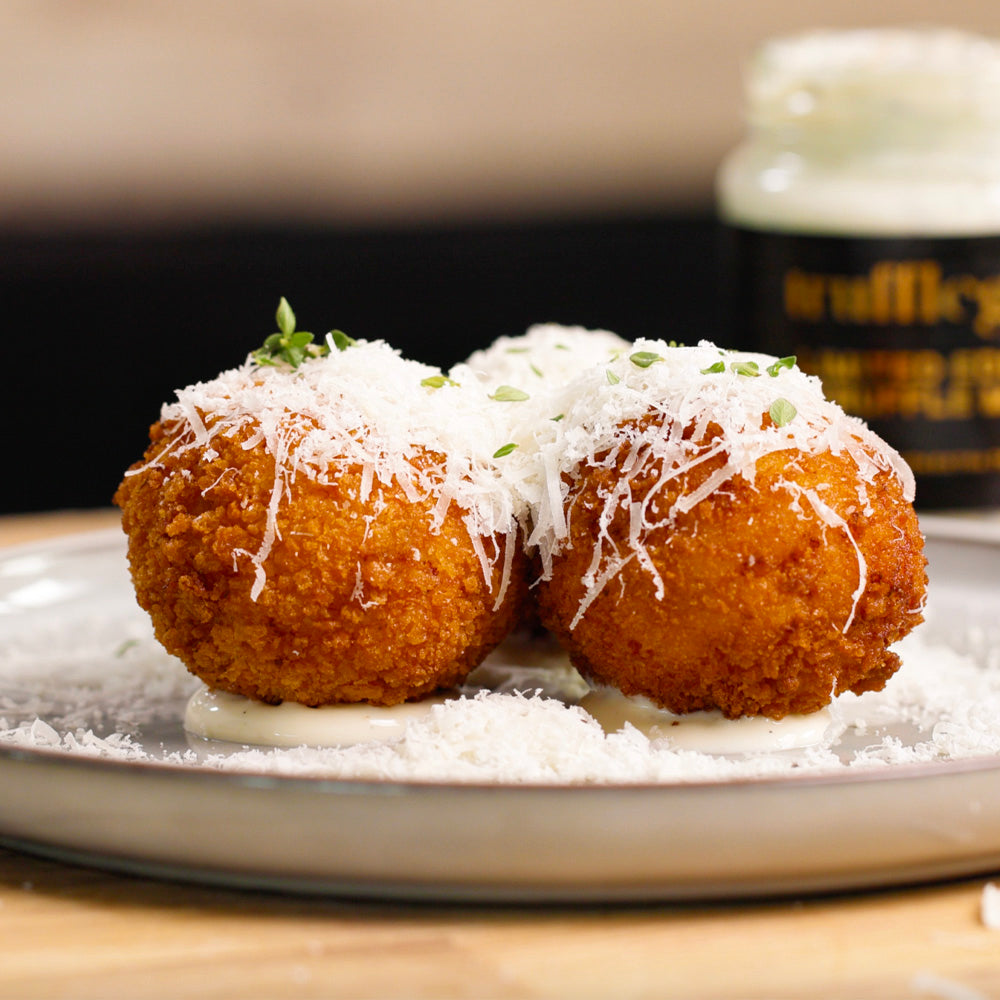 - Plate on a bed of Truffle Guys Ultimate Truffle Mayo for each arancini and finish with some grated parmesan cheese.