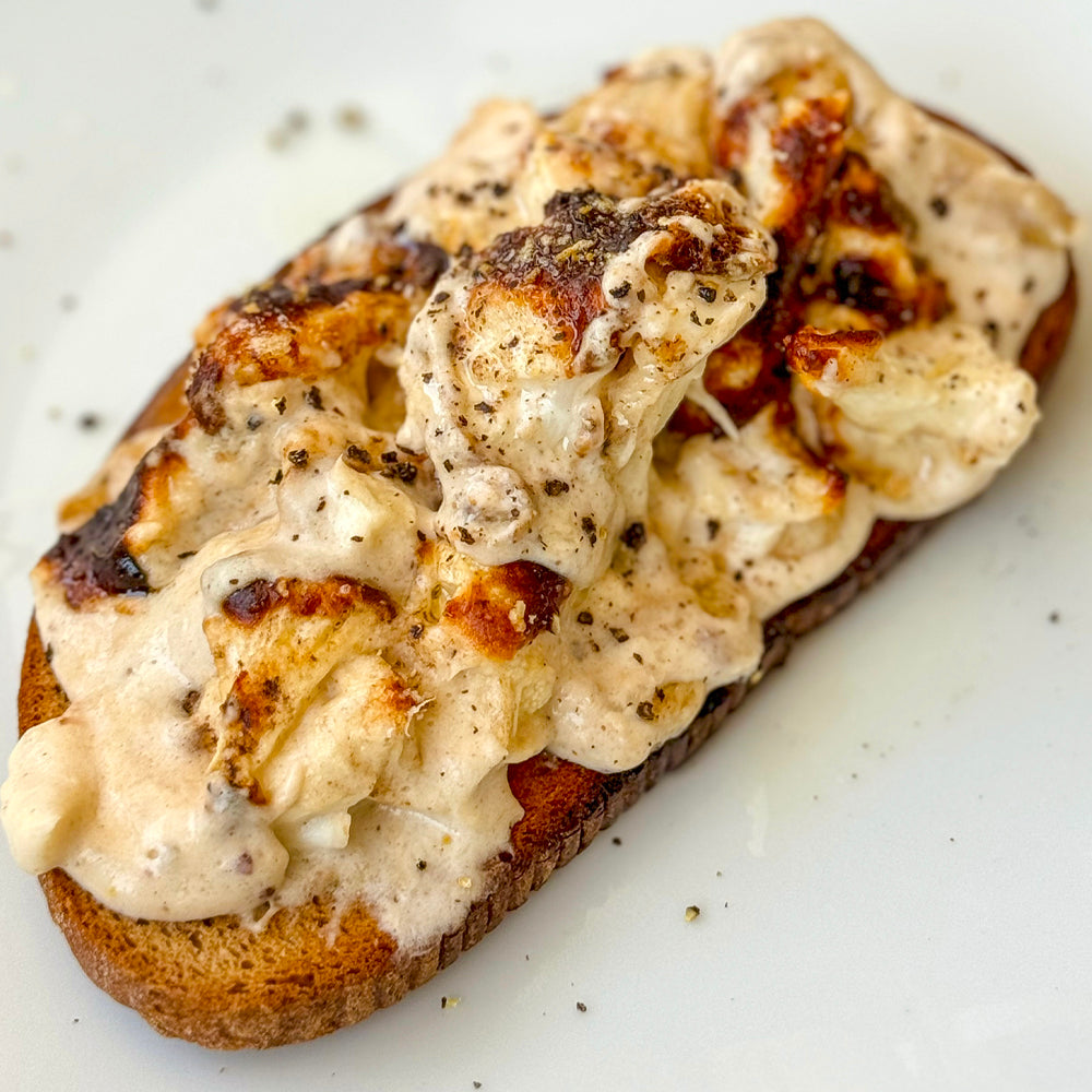 - Top your toast with the cheesy cauliflower and finish with a light drizzle of White Truffle Oil