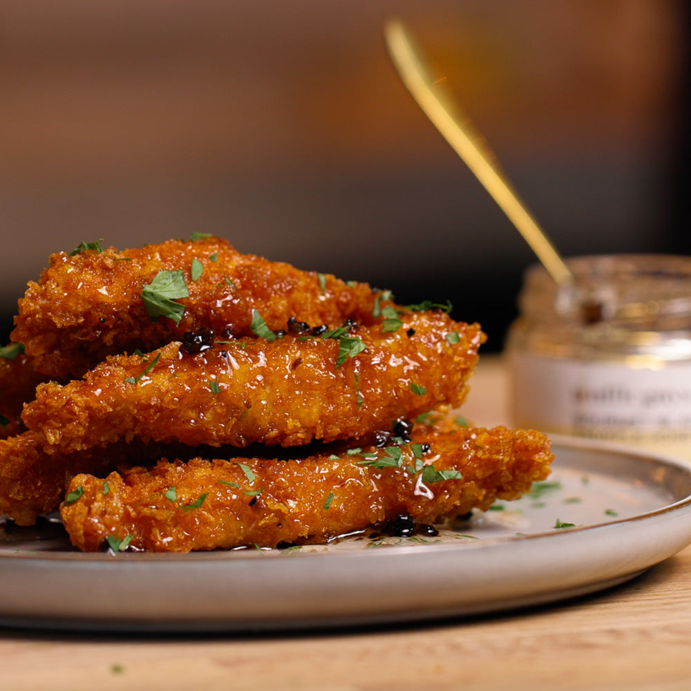 Get ready to experience a flavour explosion like no other. Imagine biting into a perfectly crispy, golden fried chicken tender that's been truffle infused, all balanced to perfection. Then, just when you think it can't get any better, you go completely rogue and drizzle Truffle Honey all over. The truffle honey takes this classic dish to new heights, with the rich, earthy flavours of truffle mingling perfectly with the sweet, sticky honey. This dish is the epitome of ‘everyday’ meeting ‘luxury’. So go ahead, indulge yourself, and let the flavours of truffle and honey take you on a culinary journey you'll never forget.View Recipe Video
