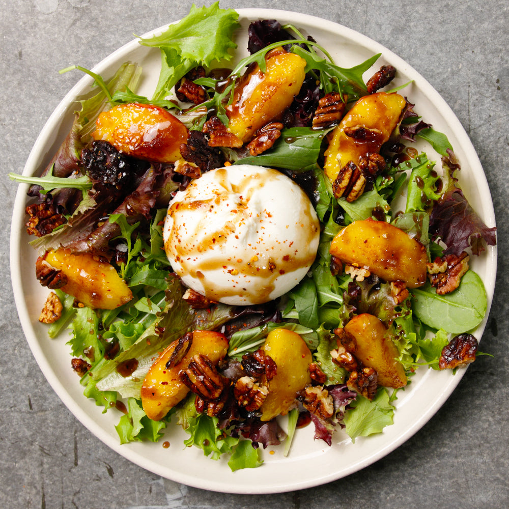 -To plate, add your leaves and some roughly torn basil and place your burrata in the centre. Place your charred nectarines and shower your toasted pecans and season with the salt and chilli flakes.