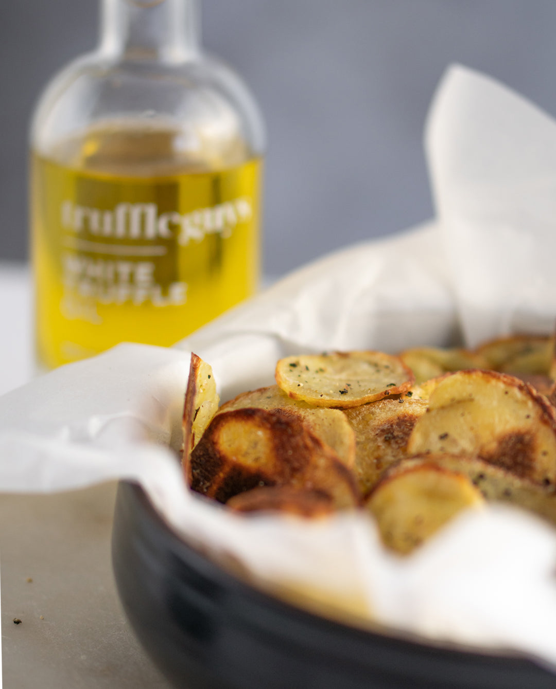 - Slice the potatoes into a bowl and immediately toss them with White Truffle Oil
