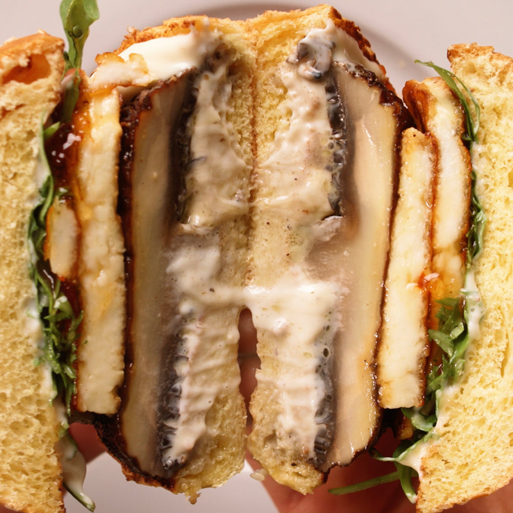 - To assemble, spread some truffle mayo on the bottom of the bun then add the mushroom, halloumi, chilli jam and rocket and top with the bun.