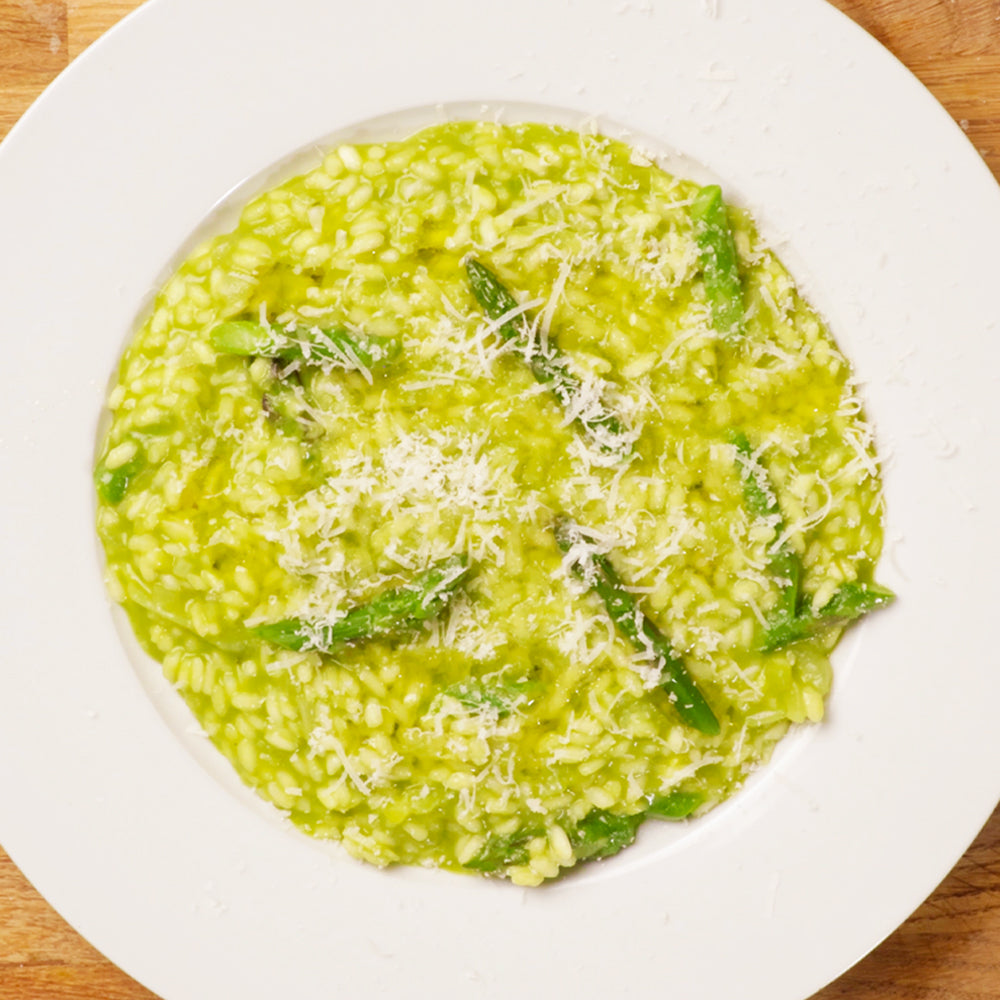 - Once your risotto is ready, add your green sauce and cook for a couple of minutes bringing all the flavours together. Add the asparagus tips, a knob of butter and grated parmesan cheese. Plate and drizzle with Truffle Guys Truffle Oil and enjoy this rich tasting earthy revelation.