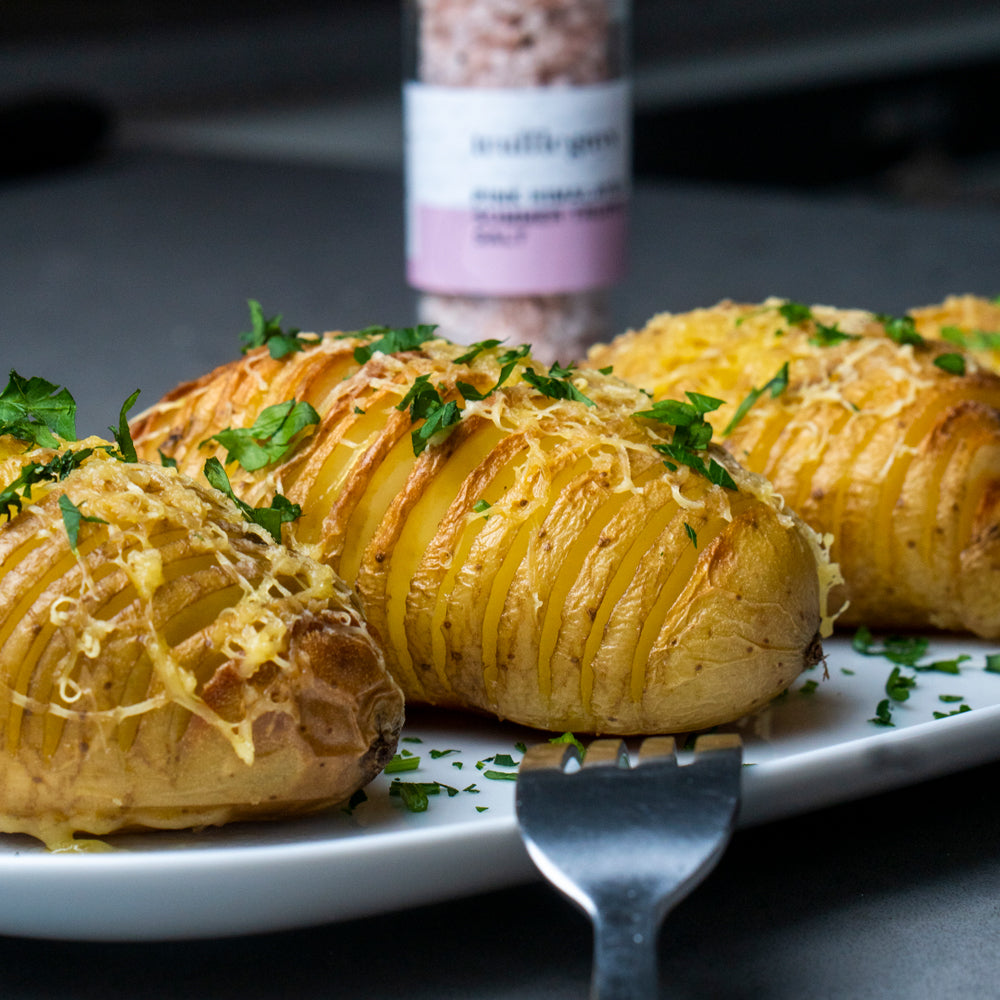 - Remove the potatoes once again and get your strong hand on. Grind the Truffle Guys Pink Himalayan Truffle Salt until you have showered each potato with some truffle magic. Sprinkle some chopped parsley and serve.