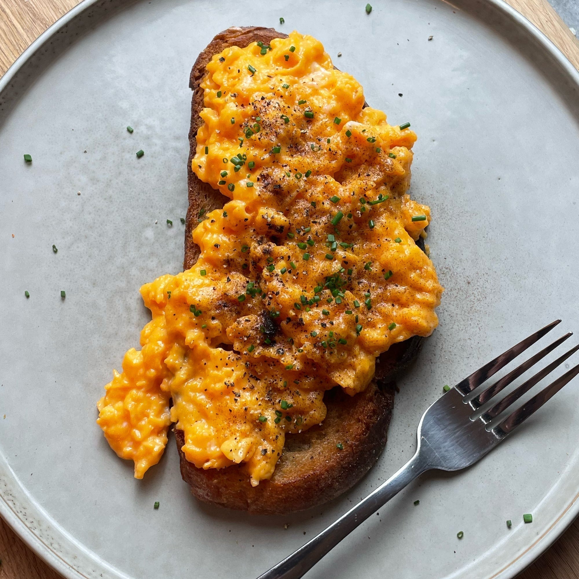 - Return to the eggs, remove from the heat, and give them one final gentle stir for 30 seconds. They should be glossy, silky, and just slightly runny.