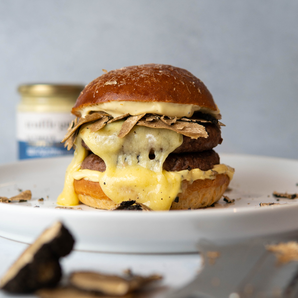 - Generously coat the warm burger buns with Ultimate Truffle Mayo (both sides)