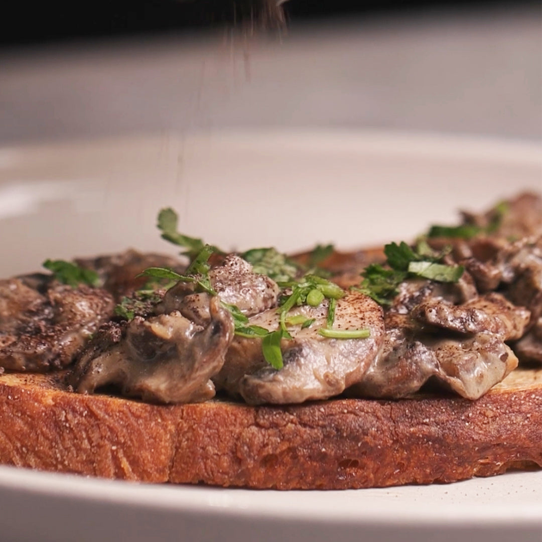 - Plate up by adding your truffled mushroom mix on top of your toast. Finish up with a shaking or two of the Signature Truffle Dust as well as adding the parsley for freshness